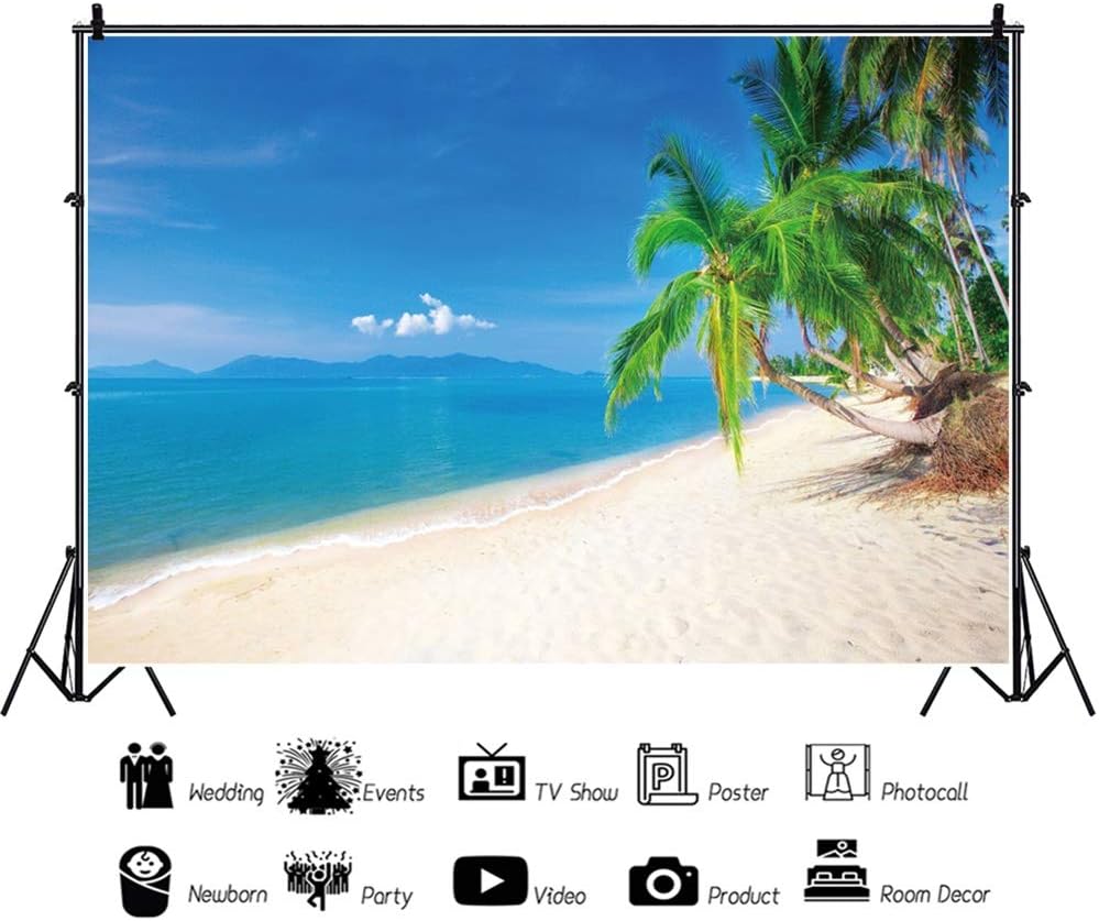 Laeacco 8x6 5ft Tropical Beach Background White Sand Palm Trees Blue Sea Clear Sky Distant Hills Backdrop Tropic Tour Shore Party Sun Tanning Baby Shower Birthday Backdrop Photo Shoot Props Vinyl Photo Backgrounds